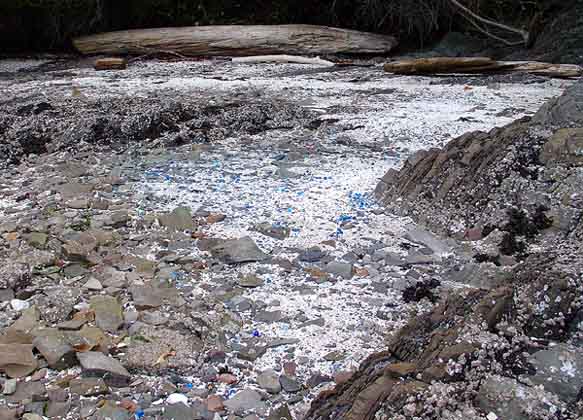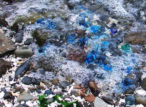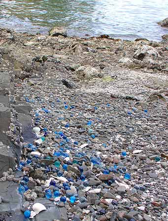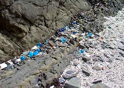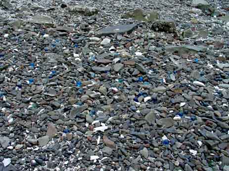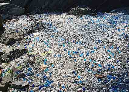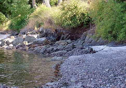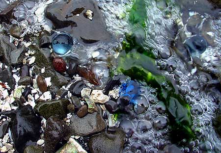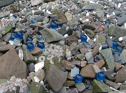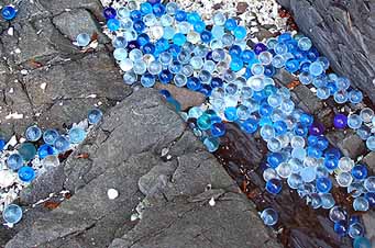 September 16, 2007 I went by the beach at a mid-high tide and couldn't find a trace of the marbles. Over the last month I've met people who have said they've found some and kept them. March 12, 2008 It's only 20 km from where I live, but I haven't been back to the beach until now. There are still a few marbles hidden on the beach, but they are now low down, buried beneath stones and in the gravel. It was a low (2ft.) tide today, and I found a handful of scuffed blue marbles - - but only when I looked twice, and looked hard. March 27th 2009 A stone with paint on it, a fist-sized chunk of cement, a worn brick, chips of terracotta and delicate blue glazed porcelain. Broken green bottle glass, tiny rounded clear glass, a small piece of a cup, smooth bits of beach lumber -- and three pale blue marbles. All are human additions to this beach. I picked up the broken glass (as someone could get cut) and the three marbles. The marbles were my doing, and I’ve been properly roasted for it.by a local outdoors club. So I picked them up, although I’m sure someone else would have loved to find them. I still see them as beautiful, and still think they do no harm, embedded in this beach that has been used for thousands of years. A deep midden sits behind the beach, on top of which are houses with yards and kids, dogs and tree forts. I love this little beach so much and am always happy to be here in this big bowl of natural and man-made remains. |