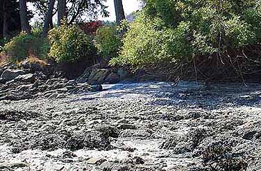 2 -5 pm I stayed at the beach for three hours, just enjoying the calm and quiet. I watched a song sparrow scratching in the seaweed and listened to Cedar waxwings, Glaucous-winged gulls and the children playing on the land above. A man came down to the other side of the cove and played with his dog for a while, but he didn't come over. The marbles have travelled down the beach, and many have settled among stones and shells about their same size and weight. |