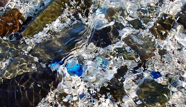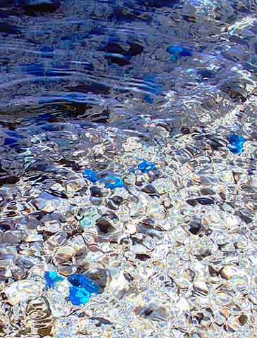 July 16 2- 4:30pm Lari came with me today, and we began collecting up the marbles. Every day they had moved further down the beach, which I'd expected. But what we found was that most had been buried - up to three inches deep. We used the sides of our hands as trowels, smoothing through the white shell sand, which was laden with marbles. We were thankful there were no clams on this beach - we didn't seem to be disturbing any creatures -- nothing visible at any rate. We collected three buckets full of marbles - about 3,000 - so there are still around a thousand left there that we couldn't find. A man came down to the beach while we were working, and told us that this tiny beach is called Treasure Beach, as tiny pieces of broken blue and white pottery and tumbled shards of amethyst glass can be found there. So now there will be a few marbles that will surface too, probably for many years, although I'll still try to collect them over the next few weeks. |