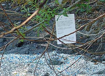 This beach is quite secluded, but I left three notes (with my name, address and a short description of the project) posted in the trees so that anyone who came upon the work would be able to contact me if they wanted to. I can't wait until tomorrow to see what has happened to them! Day 2: I returned to the beach at 8:30 this morning. The tide was dropping quickly. No one had touched the marbles and no one was on the beach. There had been a 10.8 ft high tide last night., which pulled the marbles down from where I'd placed them, but they hadn't disappeared. They lay in thick pools and drifts among the shell and stone. |