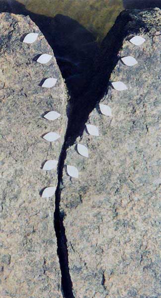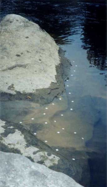 cj fleury 1. Sunday September 29 / 2002 It is 3:30 pm Eastern Standard. The small O forms are sparingly edging & tracing granite outcrops of the low, late September river. It is “studio tour” time. Throngs of other-than-tourist visitors come to the region, capture sight of the “famous” covered bridge & stand on these rocks... sound bytes of the(ir) Wakefield memory… standing on layers of summer Budding-teen romances, uncautious tans, late night swims & screams leaping from said bridge. 2. i am busying myself with this business of sorting thoughts, shell sections & the rituals of year, direction, belief… I am guarding tender lines, free to wind and water current… less set to curious photographers and “train” wanderers. At the same time i am seeing small shapes being “discovered” by a new crop of budding-teen citizens / village-zens. What’s left for next summer? It’s happening twelve months to soon & they haven’t seen high river levels yet. City ten year olds think they have new prizes from their day in the country. Brothers fight over if they are stickers or… 3. There are small future men who throw stones at anything that moves in the water. i tell them that water-beetles are not targets on a computer screen. A mother tells her sons that maybe they should give them back to the “lady.” Has she been reading my mind? The boys dutifully ask. i tell them of your projects…“Huh”…silence. They stay, so i talk of shells that could once have been buttons in “cowboy” days. They leave and take most of their collection and throw them in the river. Alas…budding teen memories and hot July promises… not for local consumption or wonder. (Artist-in-residence at the rock was NOT what i had anticipated.) Art-to-the-people, let the children “taste”-the-wonder now happens at lightening speed. 4. It is 5:00 pm Eastern Standard. The speed of “ephemerality” at the covered bridge rock “moved” me to a more private shore of the river. i go to the water at my parents. i explain to them over Earl Grey. My father, who never listens, at least interrupts less since my return from the UK. My mother offers dinner upon finishing my part II task. i go down to the different shore…submerging large discs in beet-sized river-stone shore. “How,” i ask myself, “will the water lift these shell nickels up, out and away from the crevices in which they settle. Maybe i will find them … rewards… i go up further past the “odd” neighbour’s shorelines. The squares are for last… playing with dancing surface under water as last indulgence. i finish and dawdle with the waterfront “scrap” from man & nature. i think i see a submerged metal form from a church rose-window?? My father has made his octogenarian way to the foot of the stairs. He calls me for dinner. I stop playing with Diana, having “caught” her cold today over our long phone call of art & heart & dreams. xx |