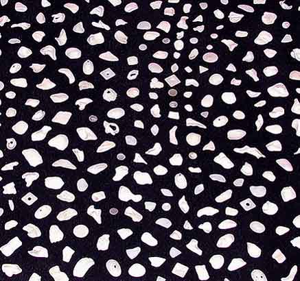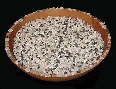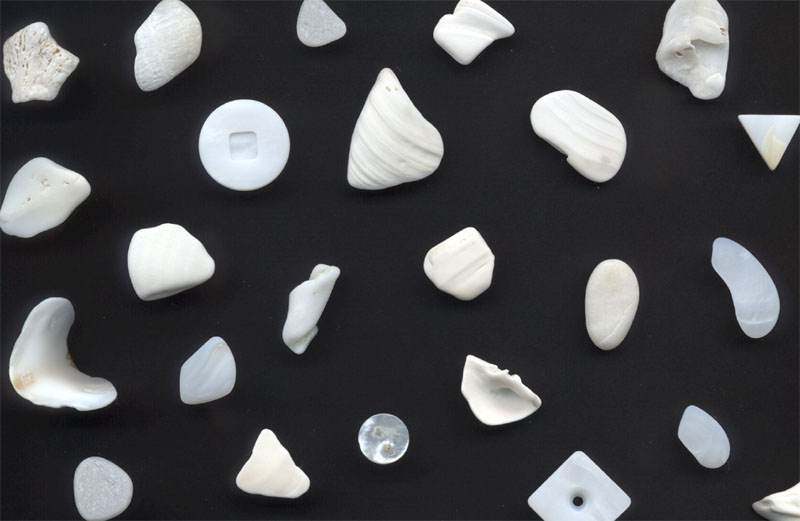 The five bowls contain sands and shells from some of the beaches where alluvion pieces were placed |