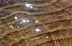 to my favourite beach in Constance Bay (one hour drive from Ottawa, 20 minutes from Kanata). The weather and nature made the delay. Because of much rain we had in May and July the level of the river was so high, that "my beach" vanished under the water. We had a flood almost until the end of June! But I got there just in time on a perfect, sunny day. Refraction of the water made wonderful patterns in the sand. The day was sunny and clear, fish came to keep me company and see the shell pieces I put "for them" in the cold water. I felt so good and focused on releasing the pieces back into the water and sand. It was very much like being in the middle of my own creation process enriched by being close to nature and so much connection - (barefoot in cold water - fantastic)...when I was taking pictures - time just stopped. -Ewa |