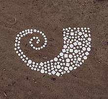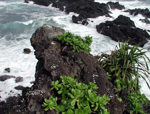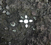 I came in the back way to Kipahulu, through rainstorms on the flanks of Haeleakala. The storm surge from a Kona Storm was making the biggest surf I had ever seen. I was placing the alluvion on a rocky headland above the waves - just a narrow sliver of lava. It was too dangerous to go down to the beach. I started making patterns with the shells - everything was fine until I looked up and saw a sudden squall approaching. There I was, perched onthis lava shelf above raging surf – with another storm about to land. I felt a sort of imminent danger – as if I had to finish quickly or I would get drenched, or swept off the cliff by a rogue wave. But when I finished placing the alluvion, the sun broke through for a minute and there was a gorgeous rainbow -- this is Hana, after all, and squalls and rainshowers and rainbows are constant here. - Michael John |