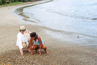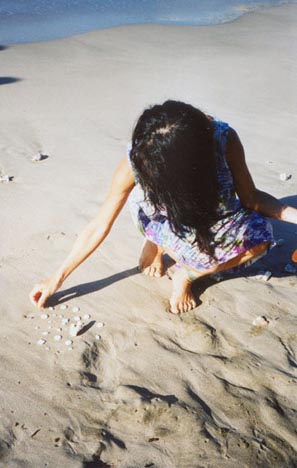 and placed them on the Mauna Kea beach on the Big Island. They looked very pretty with white sand and a piece of white coral. My Japanese friend Sanae from Maui came to see me on the Big Island and we spent one afternoon chatting on one of those 'perfect beaches'. Just before we left there, we laid out the shells around the coral bit and waited for a while for the waves to come and wash them away. Those shells melted into the beach as if they belong there. I didn't think about the future of the shells. They were there quite content as we were. They were an ephemeral trace of us being there that afternoon. – Rumi |