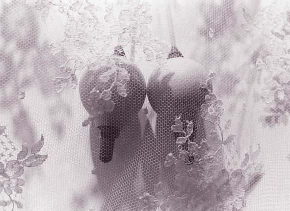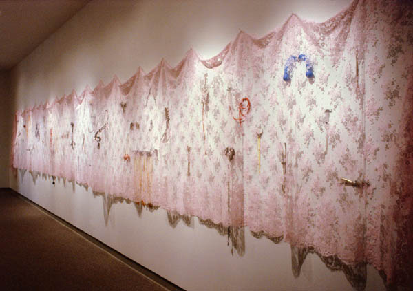 | Veil Obstetrical instruments and modified, altered or hand-made nursing equipment (both humorous and ceremonial) shrouded behind a forty-foot length of pink wedding veil. Visitors to the gallery were invited to "lift the veil." |