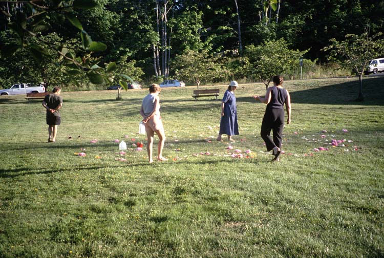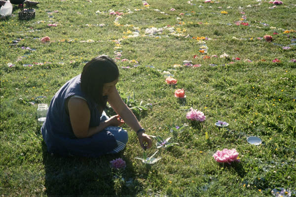 made by the community of Saltspring Island. Everyone brought or were given flowers. Everyone filled their own bowls and added them to the circle 600 bowls, dozens of people, and thousands of flowers a day of sunshine, welcoming the summer The idea for a flower circle was given to me by my friend and colleague c.j.fleury, who has created flower petal mandalas with her community in Wakefield, Quebec and in Ottawa, Ontario. Her recipe for a community flower petal mandala can be found in the Ontario Arts Council's Community Arts Workbook. cj was the first person I met who knew about the rich world of Kolam and Rangoli in India, Infiorata in Italy, and alfombras de floras in Guatemala. Since then I have researched flower traditions all over the world, and continue to discover more. If you are interested, try looking at the human flower project, a site filled with floral customs around the world. |
