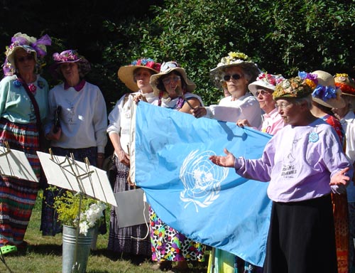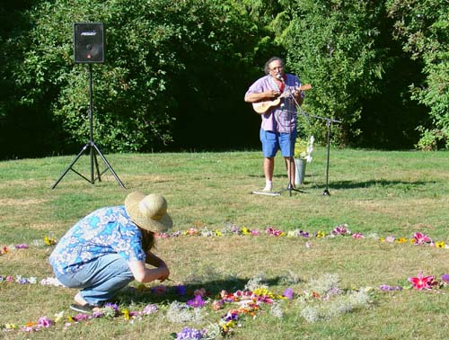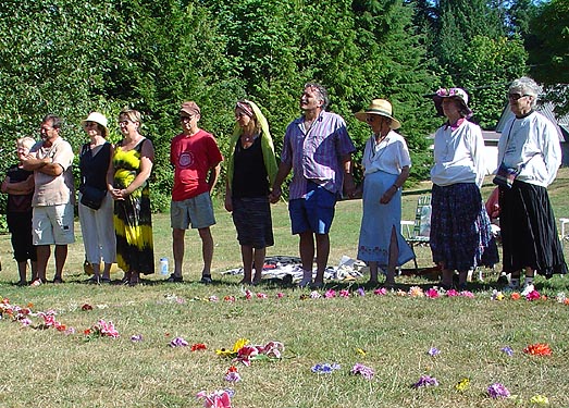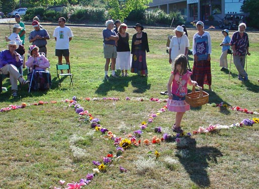 The circle is left in place for two days, then cleaned up (and the flowers composted). The Peace Group invited everyone on the island to join in this day of remembrance. Some of the groups that participated were the Saltspring Voice of Women, The Raging Grannies, and Copper Kettle. |