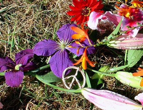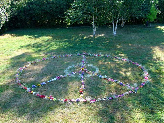 Everyone helps create the peace symbol, then more flowers are added all evening |