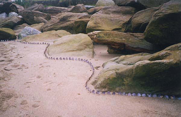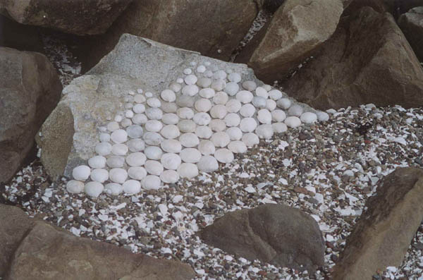 The work was created out of what was found on the beach -- stones, shells or sand. Each temporary installation was made with an awareness of the paths and actions of people on the beach, and the shape and nature of the beach itself. The work reflected whether the beach was man-made or natural, whether it was used for recreation or contemplation. It was made to fit the place, to work with the landscape, and created with the intention of doing no harm to the environment. Little or no trace of the work could be found the next day. The individual works took from two to fourteen hours to complete. People often asked why I would make something that wouldn’t last, so I’d mention to them that chefs make grand dinners that only last an hour, and gardeners tend flowers that bloom only once a year. The pleasure for me is the process of creating the work, and the sensibility that comes from being there. The awareness that something exists briefly can heighten the experience. It's like the saying "life is not a dress rehearsal" – it's this very moment that needs to be savoured, there will never be another time or day like this. It's also important to me to show people what is there - the thousands and thousands of shells on the beach, the millions of pebbles, the colours of the stones, the movement of the sand. ___ A significant component of Gesture was the time Spent tending and caretaking each place. I began Each day by walking the length of the chosen beach and picking up debris - mostly plastic bags, scrap metal, glass shards and styrofoam. Sometimes I picked up globs of tar, syringes and items that could be dangerous or unhealthy for children or animals to encounter. It felt like a healing gesture to do this. I used this time to try to understand the beach and to perceive what was happening there on that particular day - the distribution of seaweed, the way the beach had been rearranged by the tides, and how people and animals were using it. I didn't begin to work until I was able to gain some insight into what would be appropriate on that beach on that particular day. That insight comes with being there, taking time and giving full attention to what was around me. |