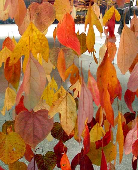 Statement Recently a woman said to me, "I think the most important and necessary role of the artist right now is to teach us that every living thing on this earth is sacred." It's a bold and encompassing statement, and one I agree with. It's also an overwhelming idea to completely comprehend. Is every seed, every mosquito and every strawberry sacred? And if so, how do I live my life and create artwork being constantly aware of this? Her statement creates the same challenge as my desire to do no harm. Its an impossible goal to reach, but it's the intent that matters: trying to think about the repercussions of every action. Trying to pay attention to the smallest things. This installation of carefully gathered leaves is about paying attention. Placing each leaf on a thread, so that the colours and shapes can be easily seen, gives them a second chance to be celebrated. What is here, on this campus, is miraculous. If we all really paid attention, wed be wandering around stunned at the sheer beauty of the world. |