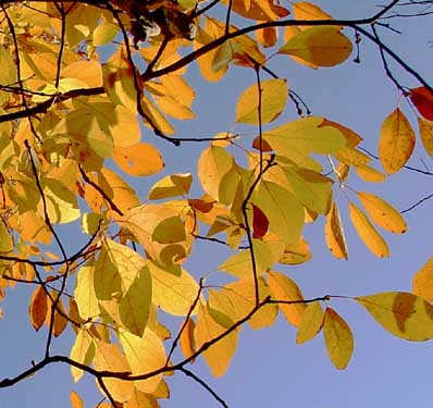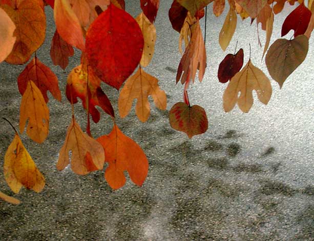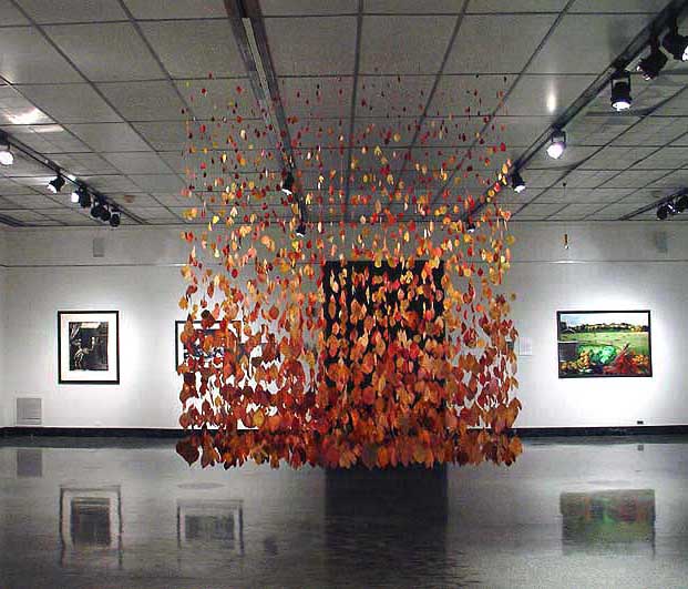 Heartwood was created at the SoFA Gallery, Indiana University Bloomington, in October 2006. It was included in Human Nature I, a two-part exhibition about artists and their relationship to science, curated by Betsy Stirrat. (please view the Human Nature website for more information about this exhibition) The installaton was created out of leaves found on the Bloomington campus during the 12 day installation period. The majority of the leaves were from native Sassafras, Redbud and Eastern Dogwood trees, with several other local and/or introduced species (Serviceberry, Firebush, Mulberry and Black Gum) threaded randomly among them. Each leaf was sewn through with linen thread and hung from the ceiling of the gallery. |