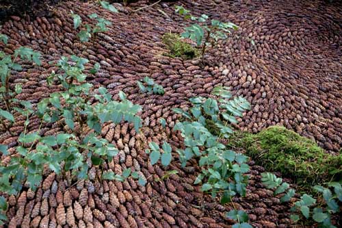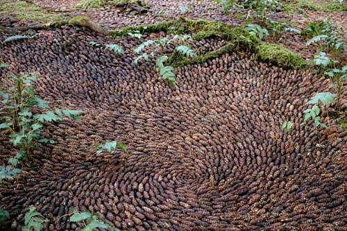 rivulets and spirals under a grove of Douglas Fir trees, Saltspring Island BC, Canada September-November 2004. This project was a further exploration of an installation made with Spruce cones Picea glauca in 2001. I was able to give two months to "On my knees" while for Picea glauca I had only three weeks. |