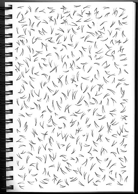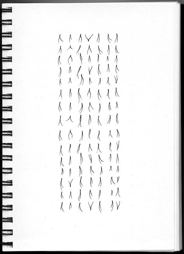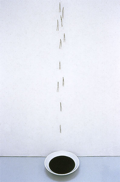 Incunabula was shown at "To Remain at a Distance 4" at Open Space in Victoria BC.in 2001. The installation featured thousands of pine needles pinned to the wall, a large white bowl full of black ink, a table, and a sketchbook filled with drawings and thoughts, some of which are shown here. |