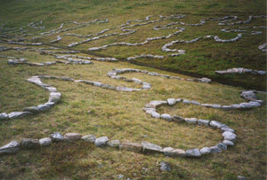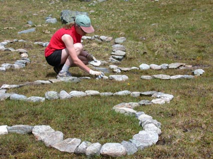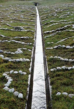 Artist's Statement I chose to work in the valley below the dam because it wasn’t pristine. Bulldozers had shaped it and workers had laid down a culvert. It was already a space created by human hands, so I wasn’t interfering with the fragile alpine ecosystem. This gave me more scope than I normally have with my environmental work, as I am usually bound by the desire to be as discreet as possible. At this site, I could draw large across the landscape, and it would work. The landscape at Silvretta is powerful; the sheer face of the dam holding back the water, the uninterrupted line of the hydro pipe, and the force of the mountains themselves. It was exciting to feel such power, but it seemed appropriate and necessary to create a piece that employed a contrasting gestalt – as a form of balance or counterpoise to what was there. So I made a piece that lay down, that pooled and took its time, that moved back and forth across the landscape like the gentle stroke of a hand on someone's back. I loved working with the old cement culvert, using it as the backbone for the organic shapes that wandered and grew from its course. Beginning with simple curving lines inspired by the alpine roads, the piece soon developed the shape of a living organism. It grew polyps and branches, it swayed and swelled into the forms of roots, the tissue of lungs, the interpenetration of placental cells. The entire image, as seen from the top of the dam, is in the shape of an alder or wide willow leaf. I have a wish for this piece. The grasses in the valley grow thickly, covering stones like a blanket. In a few years I'd like to see Meander under a carpet of grass, so it appears as a trace beneath the surface, a memory of something that lies hidden, but is always there. A video of Meander , filmed by Roland Haas, is available. Contact |