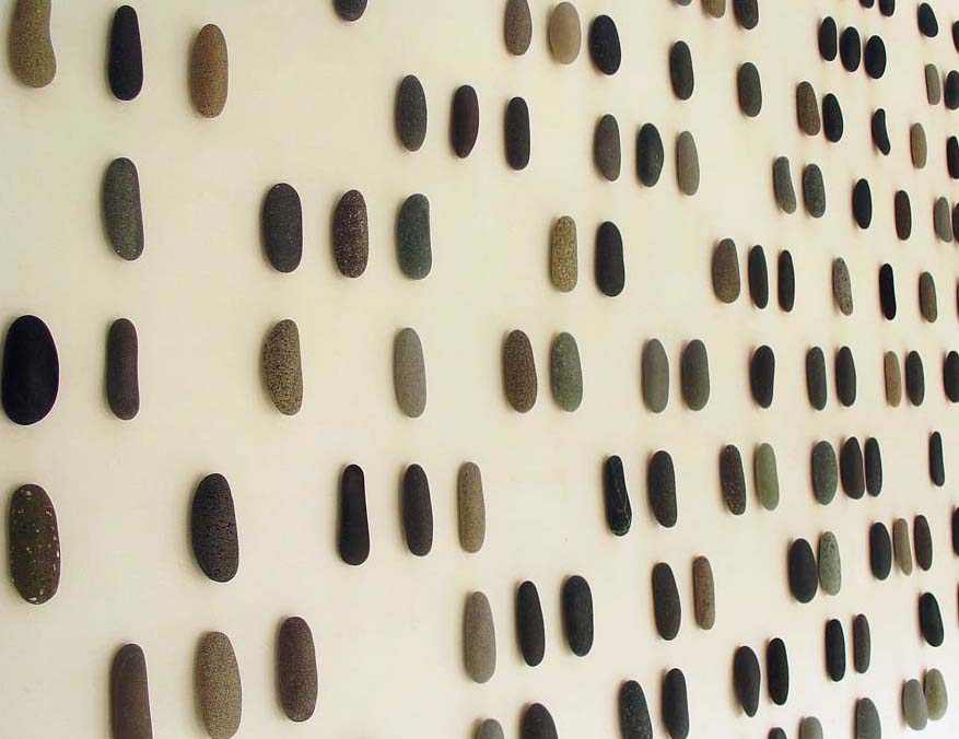 2007-8 Stones have a language I can only recieve if I'm silent. When I place these stones on the wall, I write in an indecipherable script, one that seems to be part Braille, code or musical notes . |